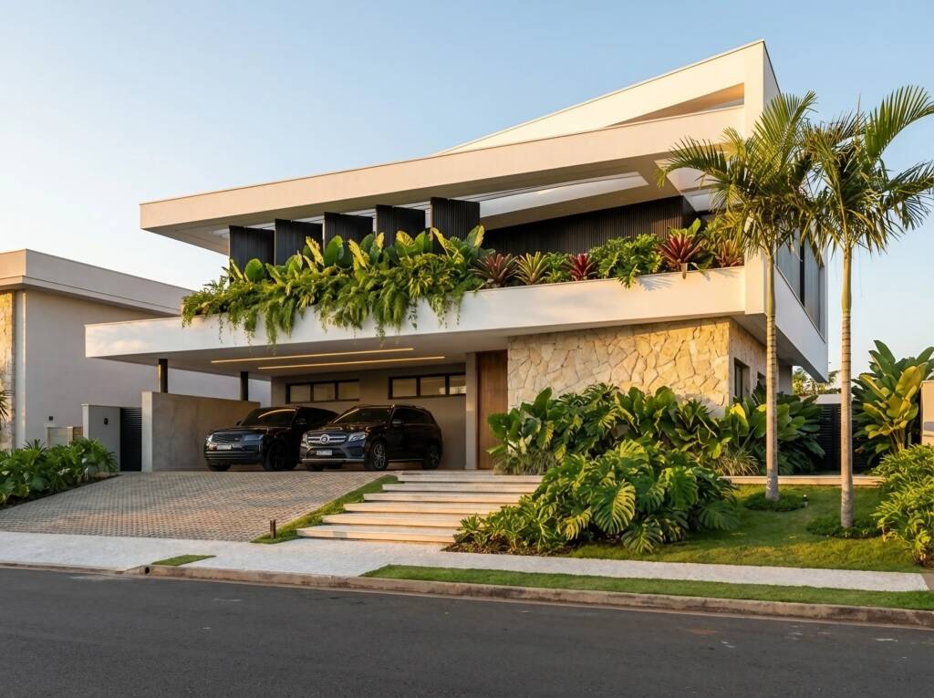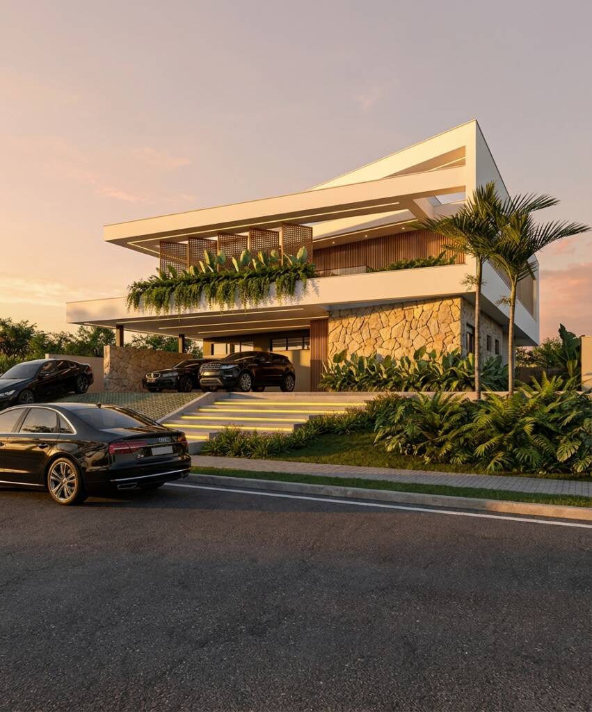 A fachada impressiona desde o primeiro olhar. As linhas contemporâneas, a seleção criteriosa de materiais e a volumetria bem trabalhada conferem à residência uma identidade visual sofisticada, perfeitamente integrada ao ambiente natural que caracteriza o condomínio. Cada detalhe foi pensado para valorizar o impacto estético, garantindo uma entrada grandiosa e, ao mesmo tempo, acolhedora.