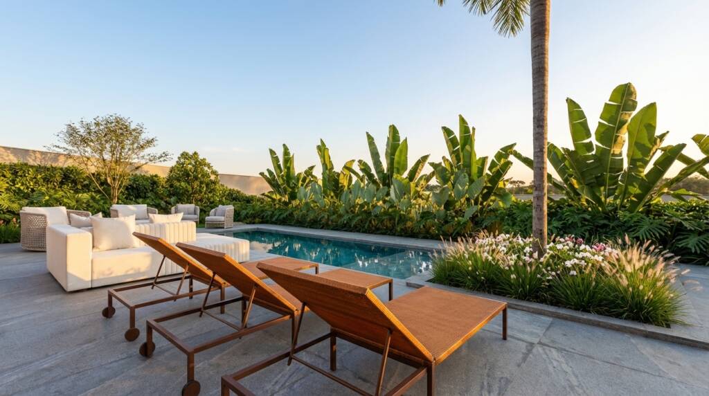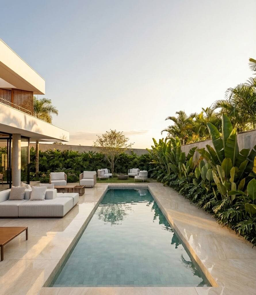 A área externa é um verdadeiro refúgio. A piscina, harmoniosamente inserida no projeto, torna-se o ponto de encontro ideal para relaxar, receber amigos ou simplesmente apreciar o clima agradável e a vista privilegiada das montanhas que cercam o condomínio.